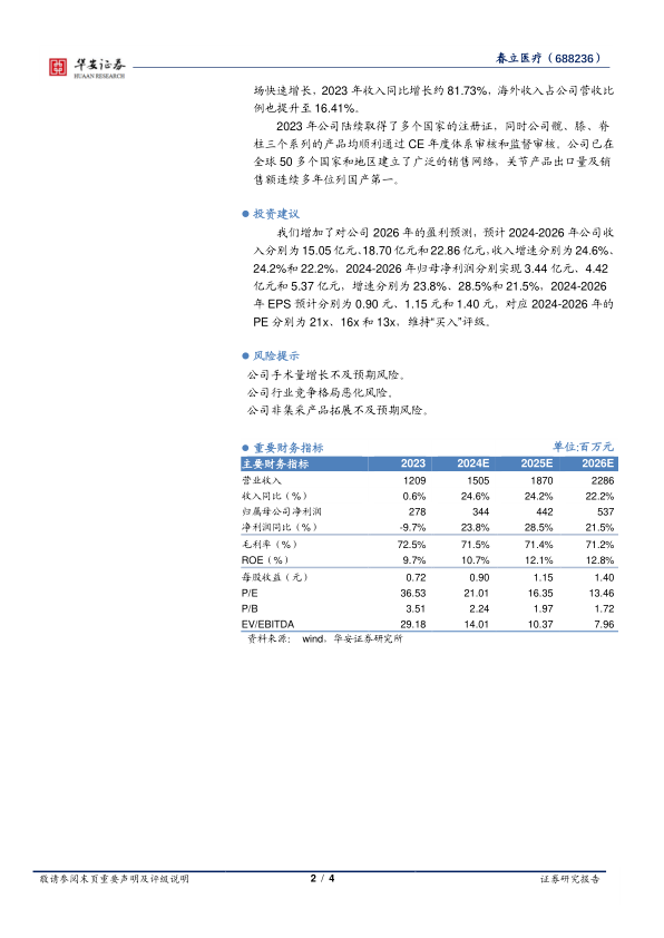 我们增加了对公司2026年的盈利预测,预计2024-2026年公司收入分别为15.05亿元、18.70亿元和22.86亿元,收入增速分别为24.6%、24.2%和22.2%,2024-2026年归母净利润分别实现3.44亿元、4.42亿元和5.37亿元,增速分别为23.8%、28.5%和21.5%,2024-2026年EPS预计分别为0.90元、1.15元和1.40元,对应2024-2026年的PE分别为21x、16x和13x,维持“买入”评级。