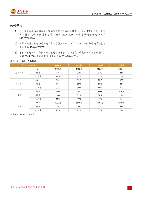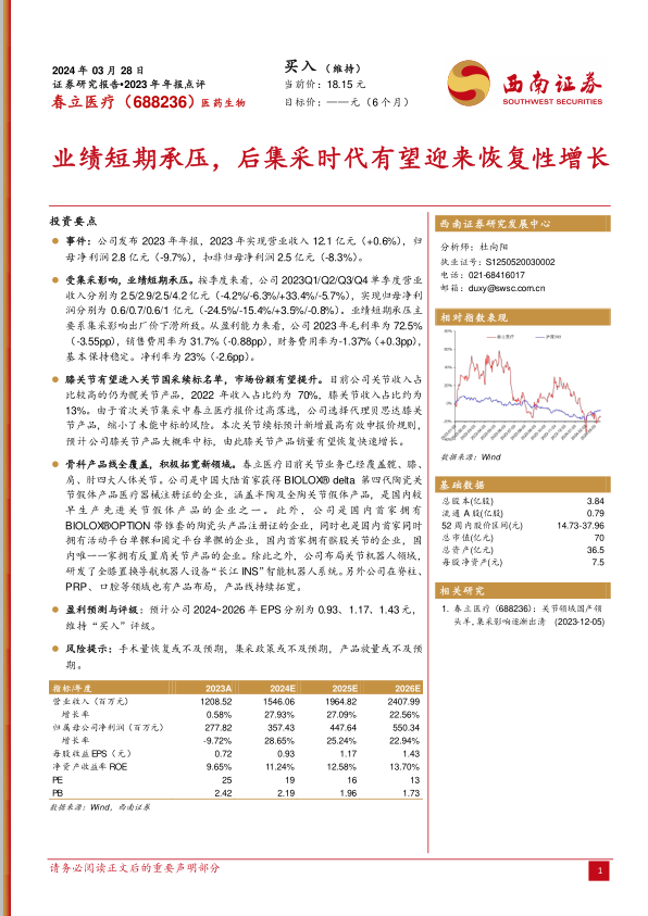 本报告分析了春立医疗2023年年报,指出公司业绩短期受到集采影响承压,但长期来看,随着膝关节有望进入国采续标名单,以及公司在骨科产品线的全面覆盖和积极的新领域拓展,公司有望迎来恢复性增长。维持“买入”评级,并预测公司未来盈利能力将持续提升。同时,报告也提示了手术量恢复、集采政策和产品放量等方面的不及预期风险。
