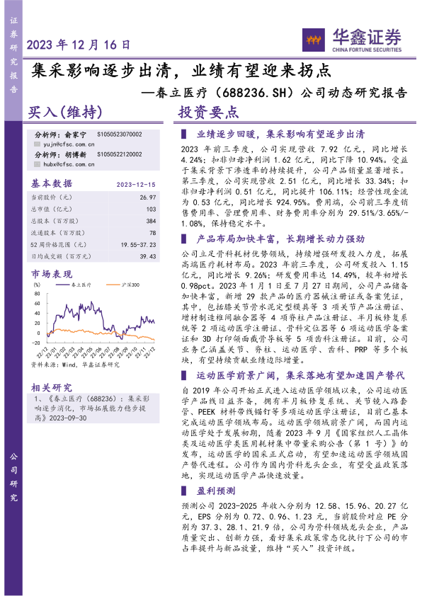当前股价(26.97元,截至2023年12月15日)对应的市盈率(PE)分别为37.3倍(2023E)、28.1倍(2024E)和21.9倍(2025E)。鉴于公司作为骨科领域的龙头企业,产品质量突出且创新能力强劲,以及在集采政策常态化执行下市场占有率有望持续提升和新品放量的预期,分析师维持“买入”的投资评级。