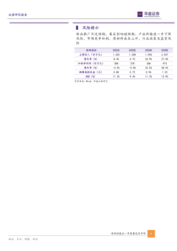 新品推广不达预期、集采影响超预期、产品价格进一步下降风险、市场竞争加剧、原材料成本上升、行业政策及监管风险
