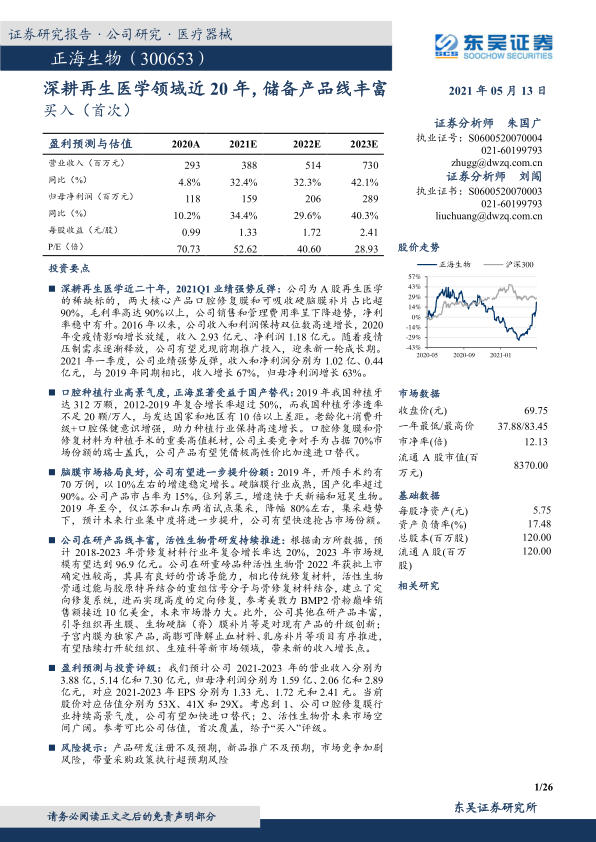 基于公司口腔修复膜行业持续高景气度、加速进口替代以及活性生物骨广阔的市场空间,预计公司2021-2023年营业收入分别为3.88亿元、5.14亿元和7.30亿元,归母净利润分别为1.59亿元、2.06亿元和2.89亿元,对应EPS分别为1.33元、1.72元和2.41元。当前股价对应估值分别为53X、41X和29X。首次覆盖,给予“买入”评级。