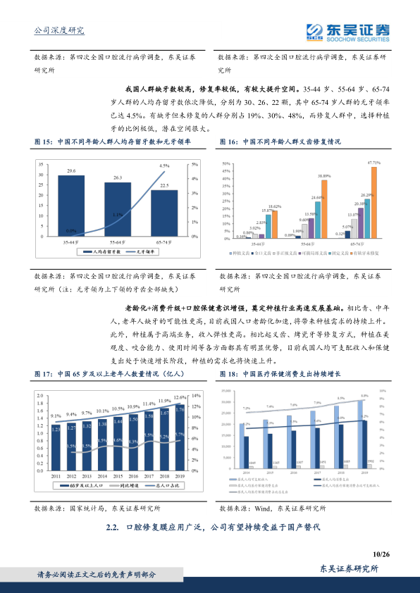 口腔种植行业高景气度,正海显著受益于国产替代: 2019 年我国种植牙达 312 万颗,2012-2019 年复合增长率超过 50%,而我国种植牙渗透率不足 20 颗/万人,与发达国家和地区有 10 倍以上差距。老龄化+消费升级+口腔保健意识增强,助力种植行业保持高速增长。口腔修复膜和骨修复材料为种植手术的重要高值耗材,公司主要竞争对手为占据 70%市场份额的瑞士盖氏,公司产品有望凭借极高性价比加速进口替代。