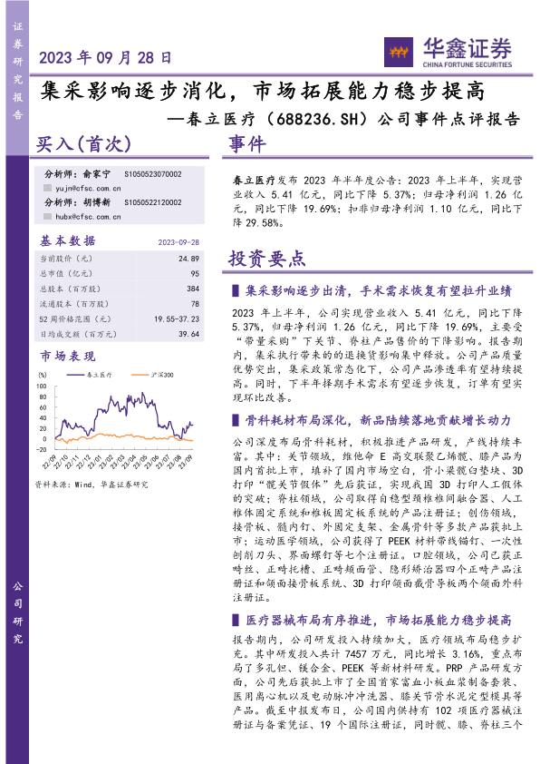 本报告分析了春立医疗2023年半年度业绩,指出公司受集采影响业绩有所下滑,但随着集采影响逐步消化和市场需求恢复,公司业绩有望回升。公司在骨科耗材和医疗器械领域积极布局,不断推出新品,市场拓展能力稳步提高,未来发展潜力巨大。首次覆盖,给予“买入”投资评级,但需关注新品推广、集采政策、市场竞争等风险。