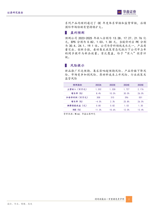 预测公司2023-2025年收入分别为13.28、17.27、21.76亿元,EPS分别为0.82、1.03、1.30元,当股价对应PE分别为30.4、24.1、19.1倍。公司为骨科领域龙头之一,产品质量突出、创新力强,看好集采政策常态化执行下公司市占率的同步提升与新品放量。首次覆盖,给予“买入”投资评级。