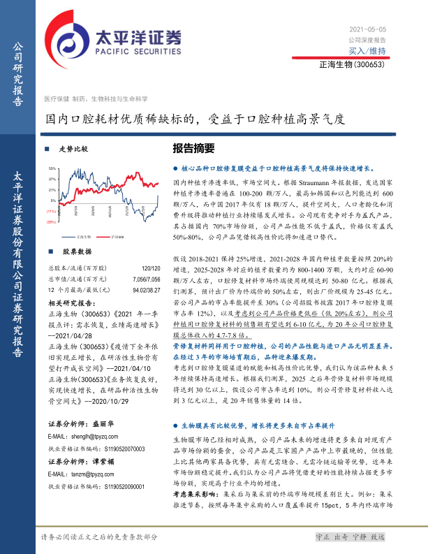 本报告分析了正海生物所处的口腔耗材和再生医学市场,以及公司的竞争优势和未来增长潜力。报告认为,公司将受益于口腔种植行业的高速发展和进口替代趋势,同时活性生物骨等在研产品的上市将为公司带来新的增长动力。尽管存在一定的风险因素,但总体来看,公司未来发展前景良好,维持“推荐”评级。