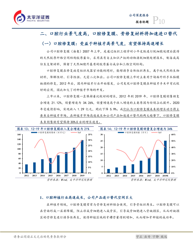 核心品种口腔修复膜受益于口腔种植高景气度将保持快速增长。