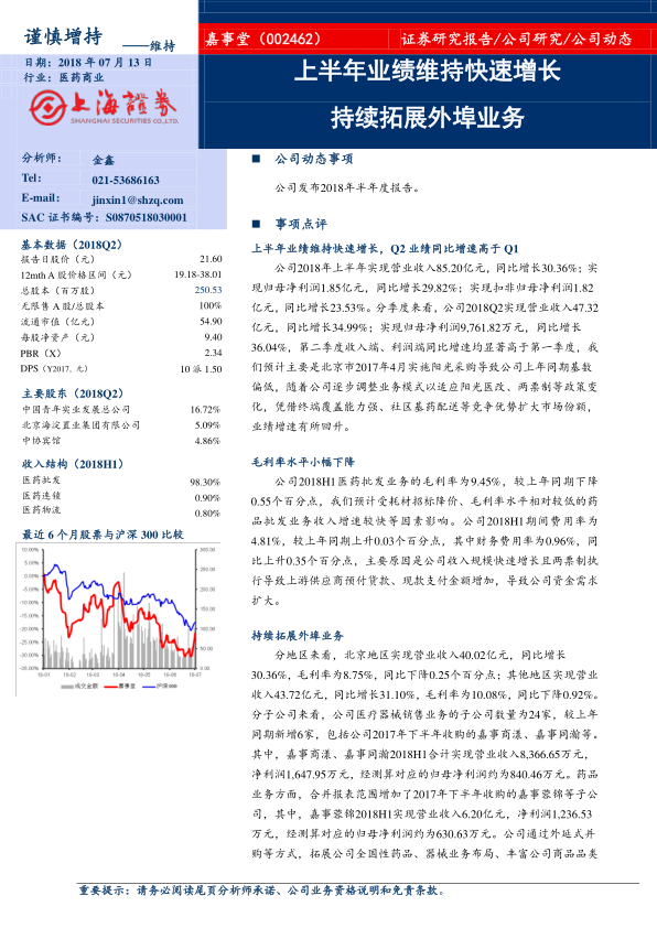 嘉事堂发布2018年半年度报告。
