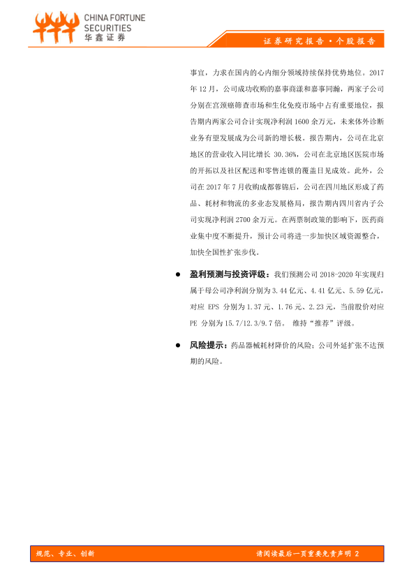 公司积极加强与知名外企的代理合作,控股子公司嘉事国润已与强生公司签署协议,成为强生电生理产品的全国唯一代理商,预计将为公司新增年化销售收入15亿以上。此外,公司正积极推进与美敦力、雅培在介入耗材领域的全国或区域性代理合作,以保持在心内细分领域的优势。2017年12月成功收购的嘉事商漾和嘉事同瀚,在宫颈癌筛查和生化免疫市场中占据重要地位,报告期内两家子公司合计实现净利润超过1600万元,体外诊断业务有望成为新的增长极。在北京地区,公司营业收入同比增长30.36%,医院市场开拓及社区配送、零售连锁覆盖成效显著。在四川地区,2017年7月收购成都蓉锦后,公司形成了药品、耗材和物流的多业态发展格局,报告期内四川省内子公司实现净利润超过2700万元。在“两票制”政策影响下,医药商业集中度不断提升,公司预计将进一步加快区域资源整合和全国性扩张步伐。