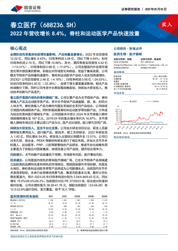 报告指出,春立医疗2022年业绩阶段性受集采和疫情双重影响,但产品销量显著增长,实现营收12.02亿元,同比增长8.43%。归母净利润3.08亿元,同比下降4.54%。2023年第一季度营收2.46亿元,同比下降4.18%,归母净利润0.56亿元,同比下降24.53%,主要系集采导致产品终端售价下降及研发投入持续加大。公司作为国内领先的骨科器械厂商,持续加大研发投入,坚定平台化发展,积极拓展脊柱和运动医学等创新产品。预计2023-2025年归母净利润分别为3.54/4.46/5.63亿元,同比增长15.0%/26.0%/26.2%。