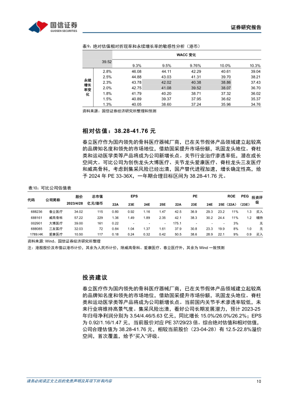 春立医疗作为国内领先的骨科医疗器械厂商,在关节假体领域具有领先市场地位,并通过国采提升市场份额。脊柱类和运动医学类产品将成为新增长点。国内关节手术渗透率低,行业未来将维持高景气度。集采风险基本出清,看好公司长期发展潜力。综合绝对估值和相对估值,公司合理估值为38.28-41.76元,相较当前股价(2023-04-28)有12.5-22.8%溢价空间,首次覆盖,给予“买入”评级。