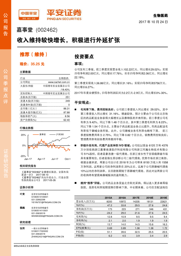 嘉事堂2017年三季报显示,公司收入维持较快增长,同时积极进行外延扩张。公司通过收购等方式,拓展业务范围,提升盈利能力。