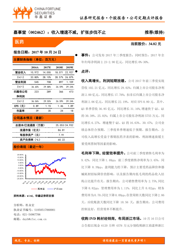 报告指出,嘉事堂在2017年前三季度实现了营收的高增长,同比增长29.02%。然而,归属上市公司股东净利润的增速却有所放缓,同比增长17.76%。这种营收增长与利润放缓的现象,主要受到蓉锦医药并表以及两票制等因素的影响。