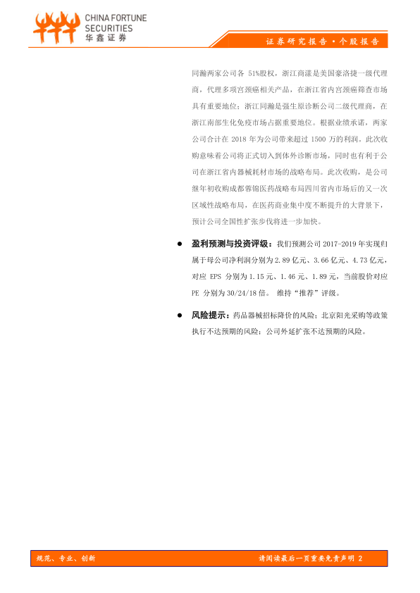 预测公司2017-2019年实现归属于母公司净利润分别为2.89亿元、3.66亿元、4.73亿元,对应EPS分别为1.15元、1.46元、1.89元,当前股价对应PE分别为30/24/18倍。维持“推荐”评级。