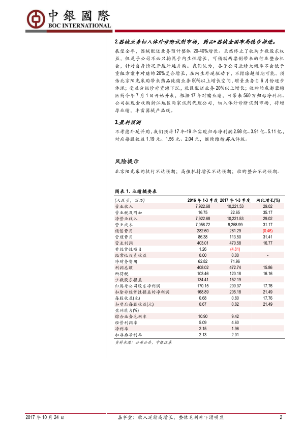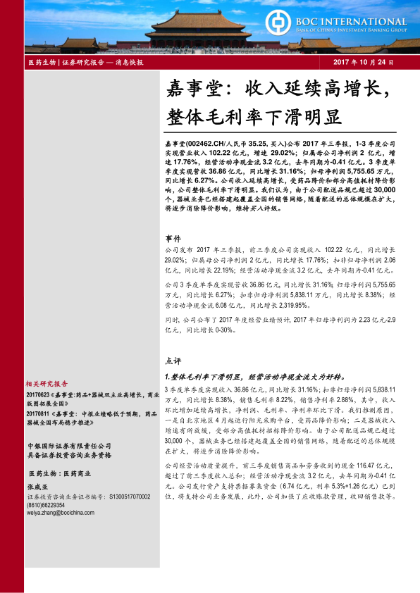 嘉事堂2017年三季报显示公司收入延续高增长,但受降价因素影响,毛利率有所下滑。公司积极拓展器械业务,全国布局稳步推进,经营活动现金流显著改善。综合考虑公司未来发展潜力,维持“买入”评级,但需关注相关风险。