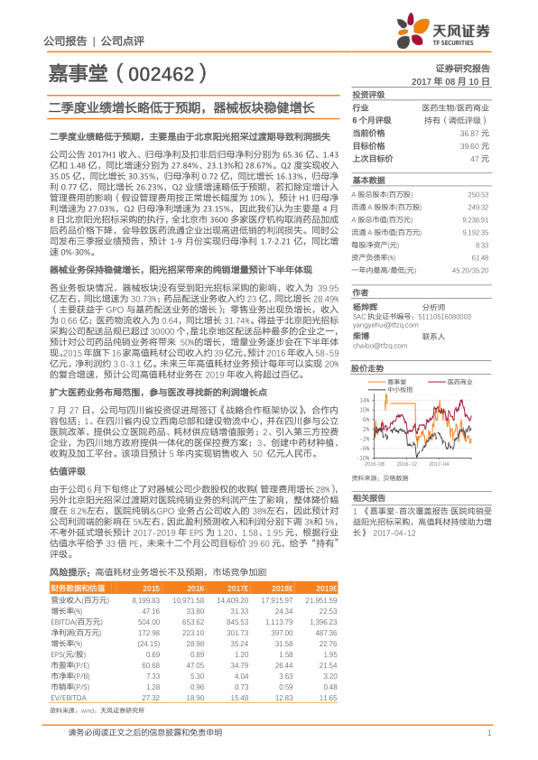 由于公司在6月下旬终止了对器械公司少数股权的收购,以及北京“阳光招标采购”过渡期对医院纯销业务利润产生影响(整体降价幅度约8.2%,医院纯销及GPO业务占公司收入的38%左右,预计对公司利润端影响约5%),天风证券下调了公司的盈利预测。预计2017-2019年EPS(每股收益)分别为1.20元、1.58元、1.95元(不考虑外延式增长)。根据行业估值水平,给予33倍PE,未来十二个月公司目标价为39.60元,评级为“持有”。主要风险提示包括高值耗材业务增长不及预期和市场竞争加剧。