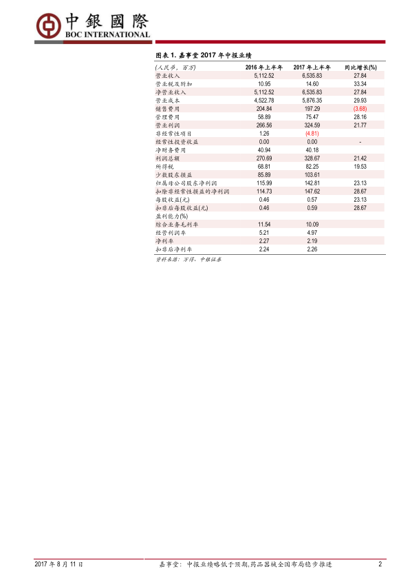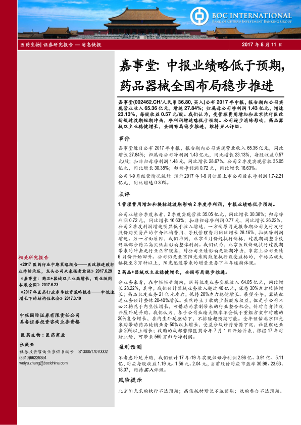 本报告分析了嘉事堂2017年中报业绩,指出其业绩略低于预期,但药品器械双主业稳健增长,全国布局稳步推进。