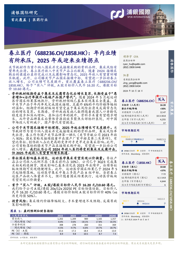 浦银国际首次覆盖春立医疗(688236.CH/1858.HK),给予“买入”评级,A股目标价人民币16.20元,港股目标价10.60港元。报告核心观点指出,尽管春立医疗2024年业绩可能因集采续约后的渠道补差价及反腐影响而有所承压,但预计2025年将迎来业绩拐点,收入有望重回增长轨道。这一增长主要得益于关节耗材作为首个纳入国采并完成接续采购的骨科品种,其集采风险有望率先出清。公司膝关节产品在接续采购中成功中标,将进一步拉动收入增长,提升业绩可见度。