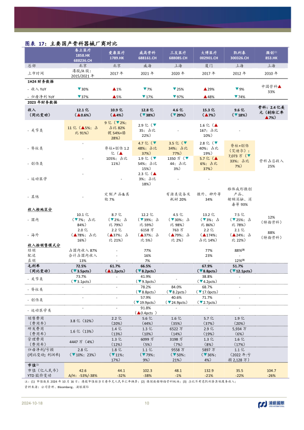 骨科耗材领域已基本实现集采全覆盖,其中关节、脊柱、运动医学产品国家集采已落地,创伤类产品也通过省际联盟集采实现全省份覆盖。2024年5月人工关节国采接续采购开标,平均价格降幅为6%,相对温和,且高低价差明显缩小(首轮2.8倍 vs 接续1.1倍)。报告预计,考虑到首轮集采已充分降价及近期政策趋势,后续脊柱、创伤和运动医学产品接续采购大幅降价的可能性较低,骨科耗材领域集采大幅降价的风险基本出清。人工关节作为首个国采品种,其集采执行时间最长,预计各骨科企业对集采接续采购后的渠道补差价工作将于2024年下半年完成,集采造成的收入增长压力将率先出清,利好以关节产品为主要收入来源的骨科企业。