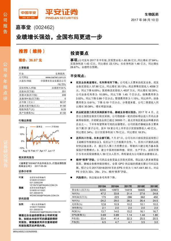 嘉事堂2017年半年度业绩表现良好,主要得益于批发业务的增长、药品配送业务的拓展以及器械业务的强劲表现。公司通过抓住北京阳光采购的机遇,成功进入更多高等级医院,并积极拓展全国市场,与四川省签订战略合作协议,有望在未来实现业绩的持续增长。尽管毛利率有所下降,但公司通过有效的费用控制,保持了盈利能力的稳定。平安证券维持对嘉事堂的“推荐”评级,并看好公司未来的发展前景。