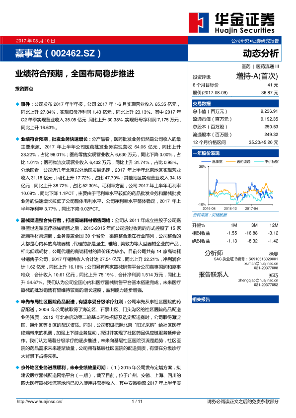 2017年上半年,嘉事堂实现营业收入65.35亿元,同比增长27.84%;归母净利润1.43亿元,同比增长23.13%。其中,第二季度单季实现营业收入35.05亿元,同比增长30.38%;归母净利润7,175万元,同比增长16.63%。整体业绩表现符合市场预期。