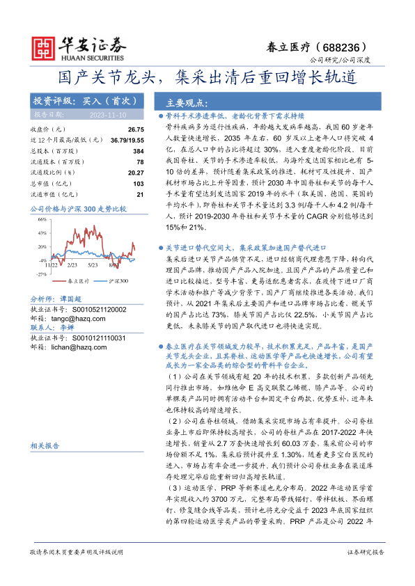 我们预计公司2023-2025年收入端有望分别实现14.03亿元、17.17亿元、21.22亿元,收入同比增速分别为16.7%、22.4%和23.6%,归母净利润预计2023-2025年分别实现2.86亿元、3.82亿元和4.81亿元,利润同比增速分别为-7.0%、33.5%和25.9%。2023-2025年对应的EPS分别约0.75元、1.00元和1.25元,对应的PE估值分别为36倍、27倍和21倍,公司是国产关节龙头企业,产品布局全面,脊柱、运动医学、PRP等多个业务增长潜力大,后续增长动能充足,首次覆盖,给予“买入”评级。