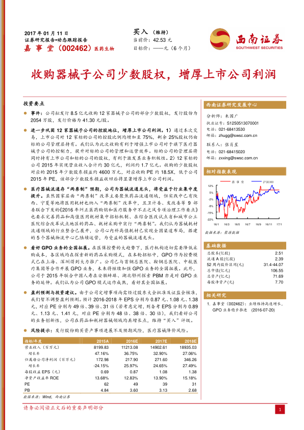 报告还分析了医疗器械流通领域“两票制”的潜在影响,认为嘉事堂作为器械流通龙头,将受益于行业集中度的提升。同时,看好公司GPO业务的全国拓展前景。