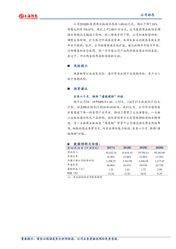 公司2018H1实现营业收入145.29亿元,同比增长0.41%;归母净利润8.40亿元,同比增长26.41%;扣非归母净利润7.71亿元,同比增长20.52%。利润增速高于收入增速,主要原因是处置子公司上海普康取得投资收益。销售毛利率上升受益于工业板块制剂业务高增长和产品结构调整。销售费用率上升主要原因是工业板块销售规模增长和医疗政策改革,公司加大精细化招商力度,销售服务与宣传费用同比增长较大。