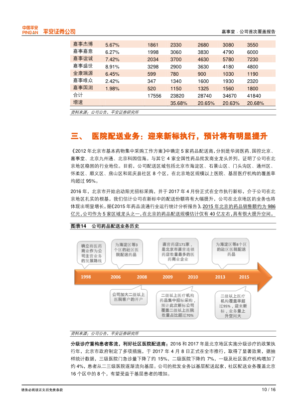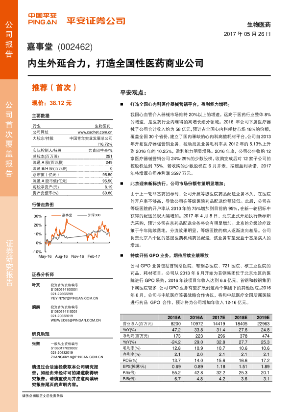 综合考虑公司在医疗器械和药品配送业务的战略布局,以及未来的盈利增长潜力,平安证券首次给予嘉事堂“推荐”评级。