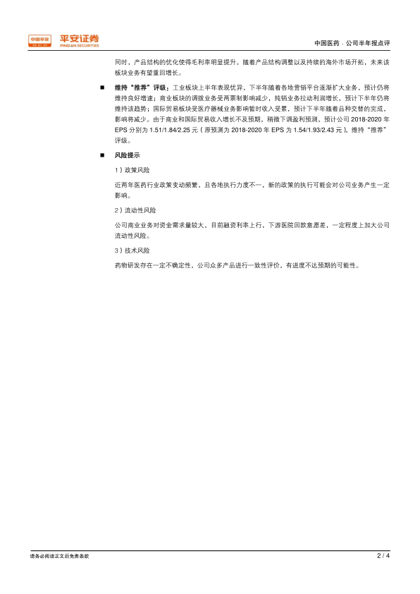 中国医药2018年上半年业绩表现良好,工业板块成为主要增长引擎,商业板块通过结构优化提升盈利能力,国际贸易板块也在积极调整。平安证券维持对公司的“推荐”评级,但投资者应关注政策、流动性和技术风险。整体来看,公司内部运营持续优化,利润维持可观增长,未来发展值得期待。