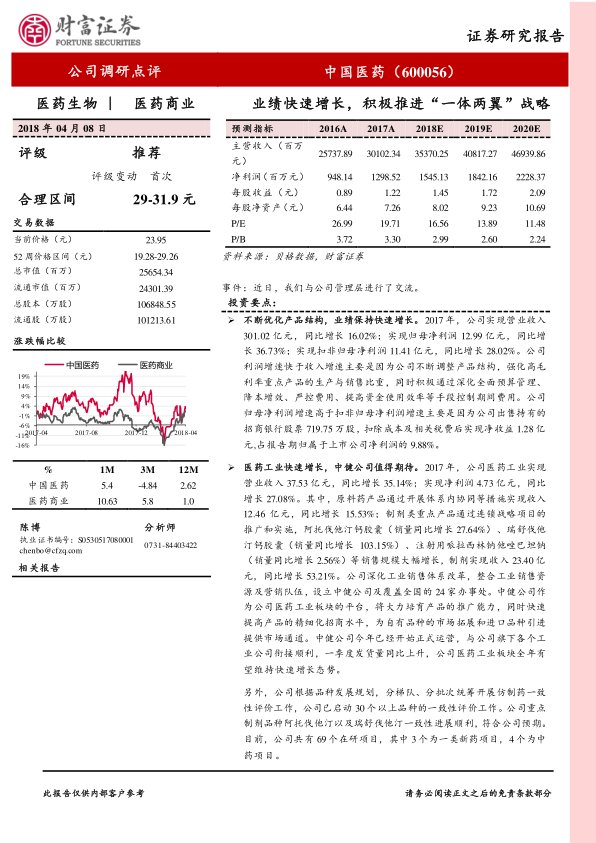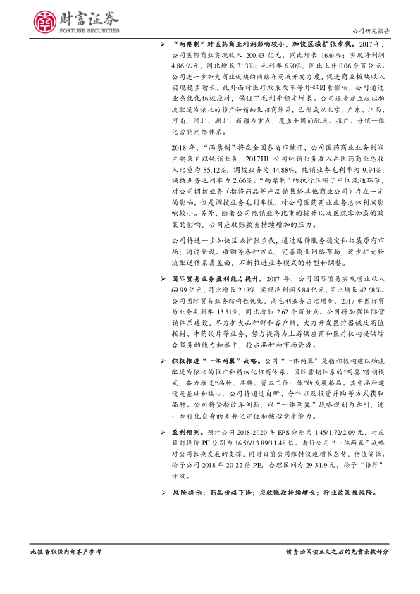 中国医药在2017年展现出强劲的业绩增长势头,营业收入和归母净利润分别同比增长16.02%和36.73%。这一增长主要得益于公司持续优化产品结构,提升高毛利产品比重,以及有效的成本费用控制。医药工业板块表现亮眼,制剂类重点产品销量大幅增长,中健公司的设立有望进一步推动工业板块的快速发展。医药商业板块在“两票制”政策下保持稳健,通过业态优化和区域扩张策略应对市场变化。国际贸易业务通过结构优化实现了盈利能力的显著提升。公司积极推进“一体两翼”战略,以品种建设为核心,旨在构建多元化的营销体系和发展格局,为长期增长提供战略支撑。尽管面临药品价格下降、应收账款增加和政策性风险,但基于其快速增长态势和战略布局,报告对公司未来发展持乐观态度,并给予“推荐”评级。