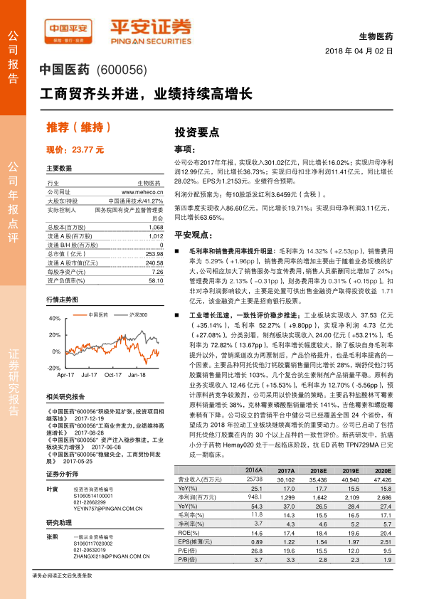 中国医药(600056)在2017年实现了显著的业绩增长,营业收入和归母净利润分别同比增长16.02%和36.73%,主要得益于其工业、商业和国际贸易三大业务板块的协同发展。公司通过优化业务结构、加强市场开拓和精细化管理,有效提升了盈利能力。