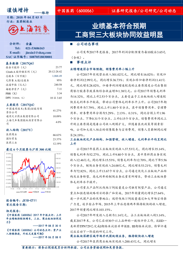 中国医药在2017年展现出强劲的业绩增长和卓越的运营效率,其归母净利润同比大幅增长36.73%,主要得益于工业、商业和国际贸易三大业务板块的协同发展和战略调整。公司通过优化工业产品结构、强化商业网络布局以及加速国际贸易转型,有效应对了行业政策变化带来的挑战,并成功提升了整体盈利能力。鉴于公司作为通用技术集团旗下唯一的医药产业平台所具备的战略优势、持续的内生增长动力以及当前合理的估值水平,报告维持“谨慎增持”评级,预示其在未来市场中具备良好的投资潜力和发展前景。