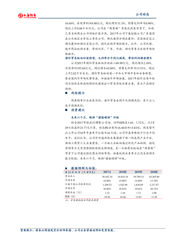 报告维持未来六个月“谨慎增持”评级。理由在于,公司作为通用技术集团旗下唯一的医药产业平台,正积极推动工商贸三大业务的整合。工业板块通过优化产品结构、强化营销等方式,有望保持较快的业绩增速。商业板块在“两票制”背景下,通过强化商业网络布局、拓展纯销业务等方式,展现出较强的内生性增长能力。