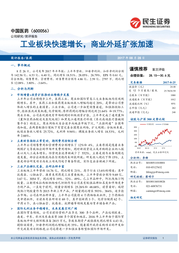 中国医药(600056)在2017年上半年表现良好,医药工业和商业板块均实现快速增长,并通过投资扩张加速了商业布局。