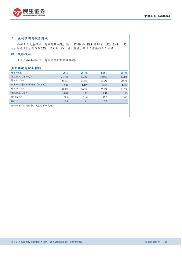 基于公司良好的发展态势,报告首次给予中国医药“谨慎推荐”评级,并预测公司未来几年的每股收益将持续增长。但同时也提示了工业产品招标降价和商业网络扩张不及预期的风险。