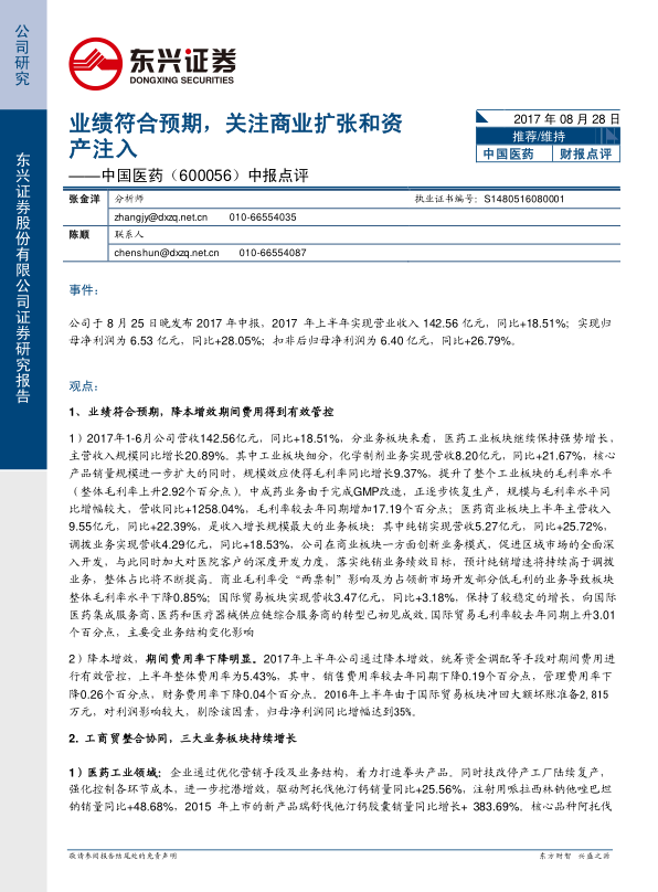 2017年1-6月,中国医药实现营业收入142.56亿元,同比增长18.51%。从业务板块来看: