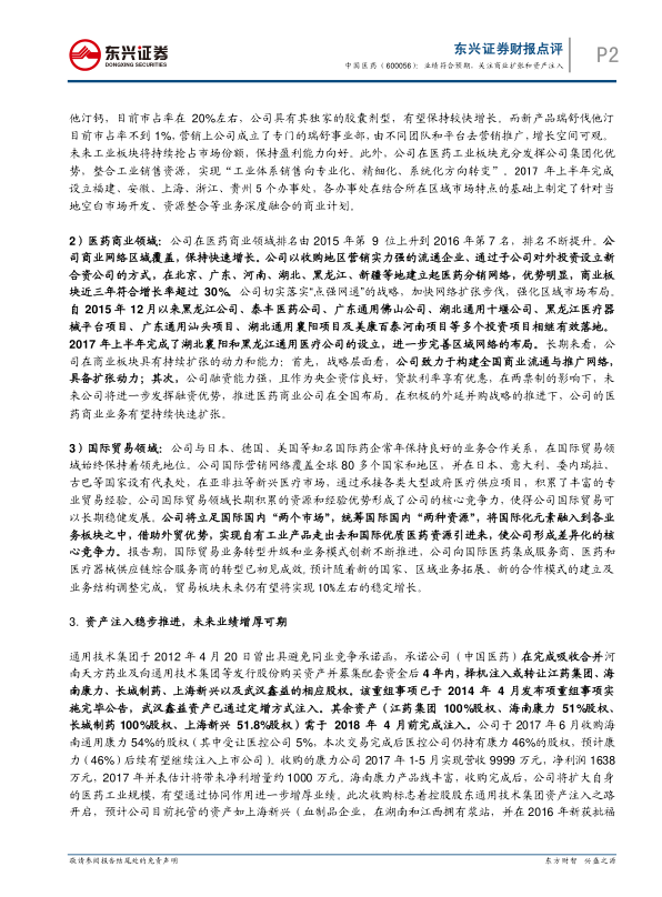 通用技术集团于2012年承诺在完成重组后4年内,择机注入或转让江药集团、海南康力、长城制药、上海新兴以及武汉鑫益的相应股权。武汉鑫益资产已通过定增方式注入。其余资产(江药集团100%股权、海南康力51%股权、长城制药100%股权、上海新兴51.8%股权)需于2018年4月前完成注入。2017年6月,公司收购海南通用康力54%的股权,康力公司2017年1-5月实现营收9999万元,净利润1638万元,预计2017年并表将带来约1000万元的净利增量。此次收购标志着控股股东资产注入之路开启,预计上海新兴(血制品企业)、长城制药(中成药企业)、江药集团等托管工业资产将加速注入上市公司,进一步扩大公司医药工业规模,并通过协同作用增厚业绩。