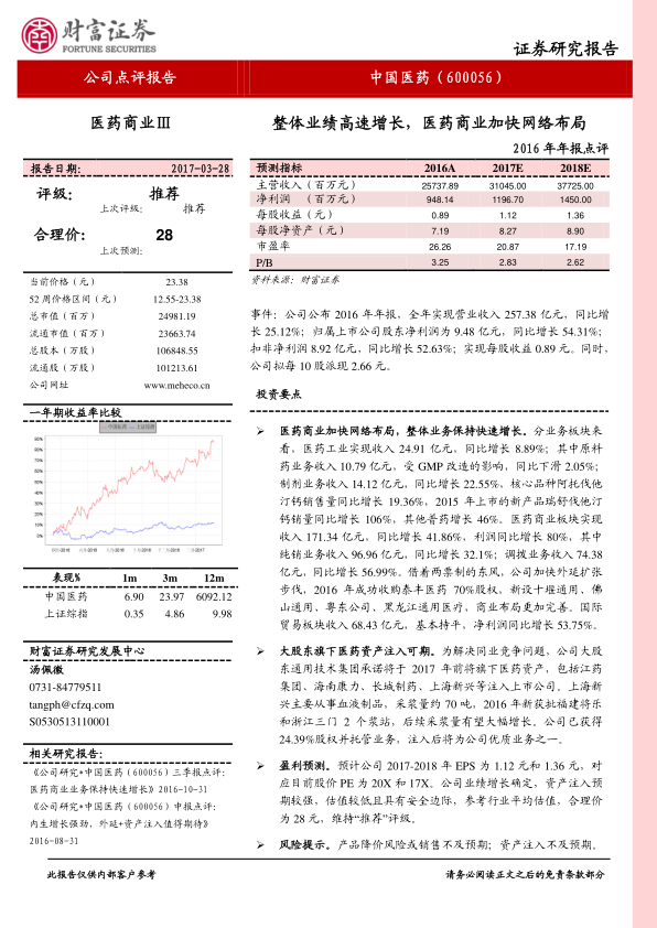 本报告对中国医药(600056)2016年年报进行了点评,指出公司整体业绩高速增长,医药商业板块通过外延扩张加快网络布局,同时受益于大股东资产注入的预期。报告维持对公司的“推荐”评级,并给出了相应的盈利预测和风险提示。