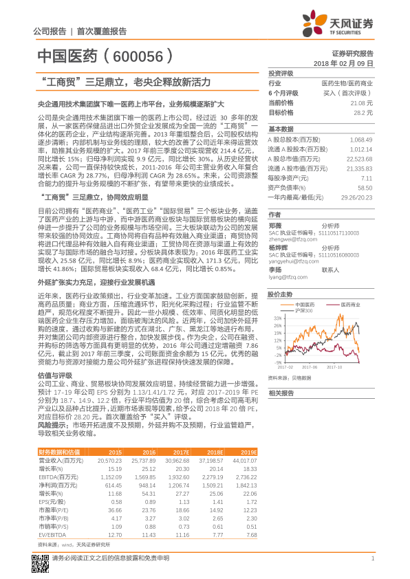 中国医药成立于1984年,是通用技术集团旗下唯一的医药上市公司。公司通过高层更换、内部机制梳理及产业整合,确立了“工商贸”一体化发展战略。三大业务板块协同发展优势明显,产业链延伸扩大了渠道和品种优势,高毛利业务与品种的重点发展完善了盈利结构,奠定了可持续发展能力。作为老央企,公司通过提高创新能力、加大研发投入、外延并购扩张商业版图、以及推动国际贸易业务转型升级,展现出新的活力,有望抓住行业变革机遇。