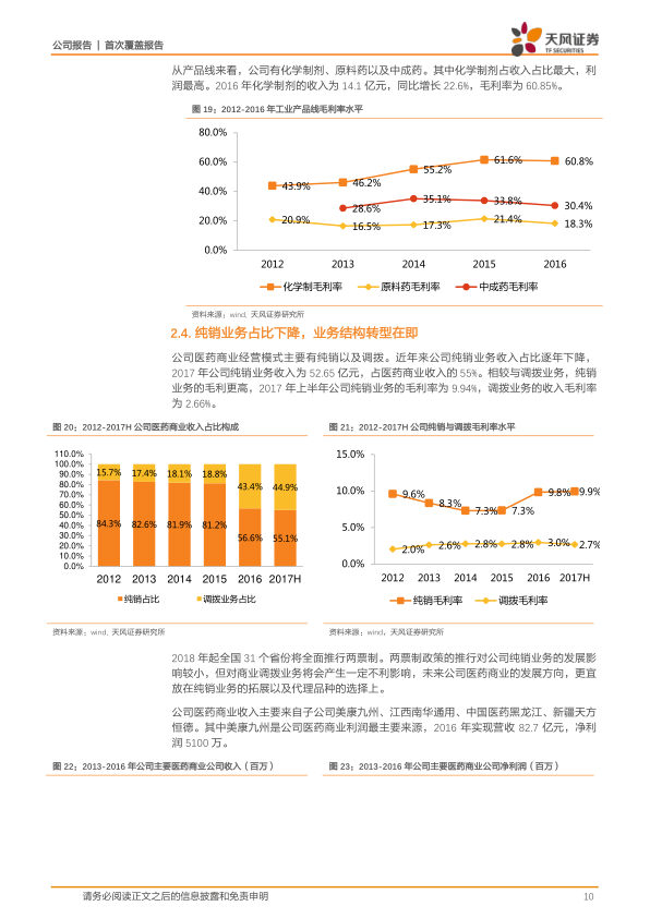 公司医药商业经营模式主要包括纯销和调拨。近年来,纯销业务收入占比逐年下降,2017年上半年为52.65亿元,占医药商业收入的55%。纯销业务毛利远高于调拨业务,2017年上半年纯销毛利率为9.94%,而调拨业务毛利率仅为2.66%。2018年起全国全面推行“两票制”,将对公司的商业调拨业务产生不利影响,但对纯销业务影响较小。未来公司医药商业的发展方向将侧重于纯销业务的拓展和代理品种的选择。公司医药商业收入主要来自美康九州、江西南华通用、中国医药黑龙江、新疆天方恒德,其中美康九州是主要利润来源,2016年营收82.7亿元,净利润5100万元。公司在巩固现有市场的同时,积极开发空白市场,并在北京、广东、河南、湖北等地布局。此外,公司紧跟行业发展,积极探索医药商业创新模式,如医院药事服务延伸、药房托管等,并加大基层医疗市场覆盖。