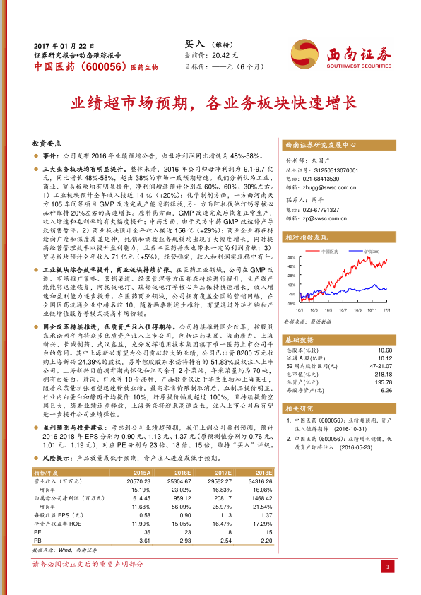 本报告分析了中国医药(600056)2016年业绩预增公告,并上调了公司盈利预测,维持“买入”评级。