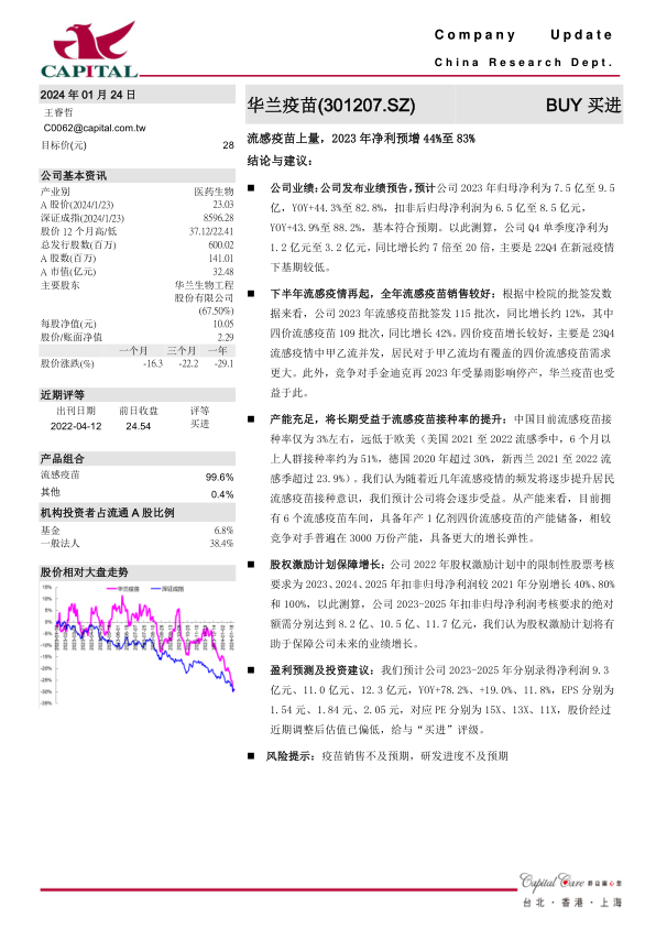 华兰疫苗2023年业绩预计大幅增长,主要得益于流感疫苗销售的增长。中国流感疫苗市场潜力巨大,公司产能充足,有望长期受益于接种率的提升。