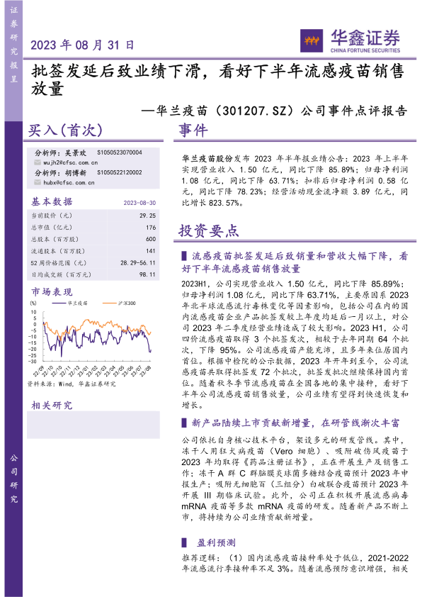 华兰疫苗2023年上半年业绩受流感疫苗批签发延后影响显著下滑,但此为短期外部因素所致。公司在流感疫苗领域仍保持国内领先的批签发量和市场份额,且经营活动现金流表现强劲。随着下半年流感疫苗接种旺季的到来,预计公司业绩将实现快速恢复。此外,公司通过狂犬病疫苗、破伤风疫苗等新产品的上市以及脑膜炎球菌疫苗、百白破联合疫苗和mRNA疫苗等丰富研发管线的推进,正逐步优化产品结构,为长期增长奠定基础。鉴于国内流感疫苗市场巨大的增长潜力及公司持续的竞争优势,报告首次给予“买入”评级,看好其未来发展。