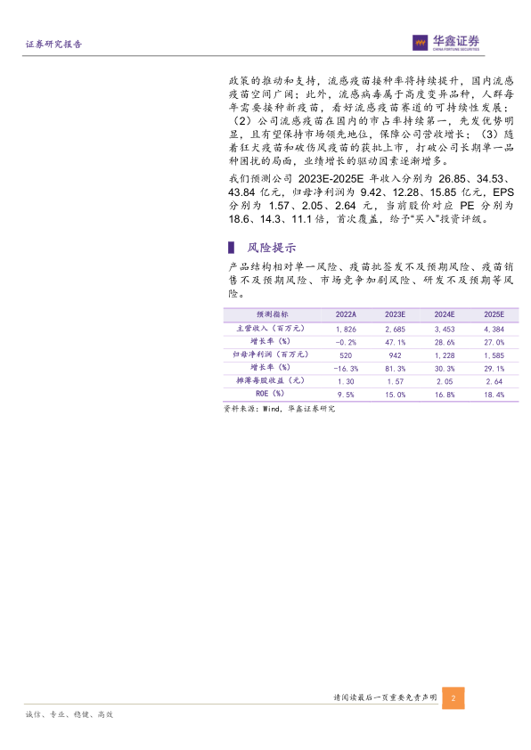 同时,报告也提示了潜在风险,包括产品结构相对单一风险、疫苗批签发不及预期风险、疫苗销售不及预期风险、市场竞争加剧风险以及研发不及预期等风险。