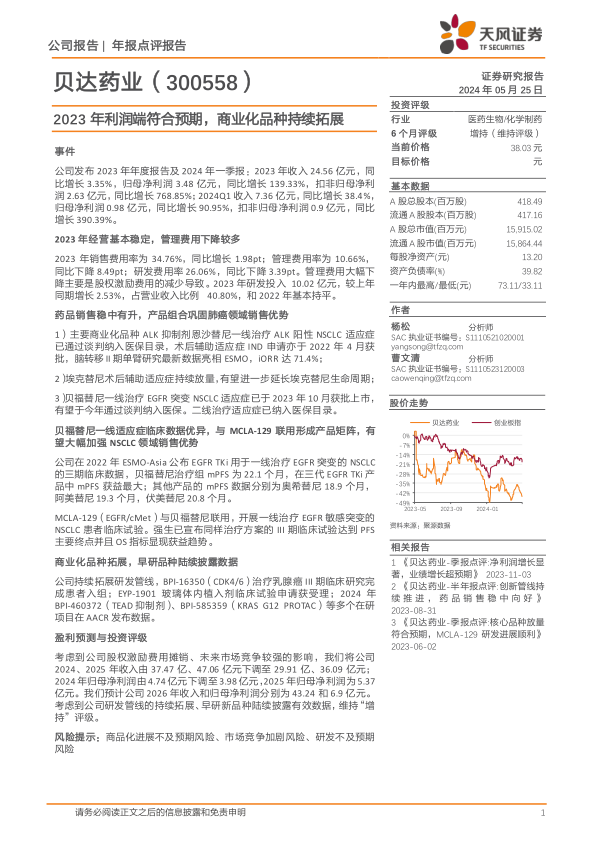 本报告对贝达药业2023年年度报告及2024年一季报进行了分析,核心观点如下: