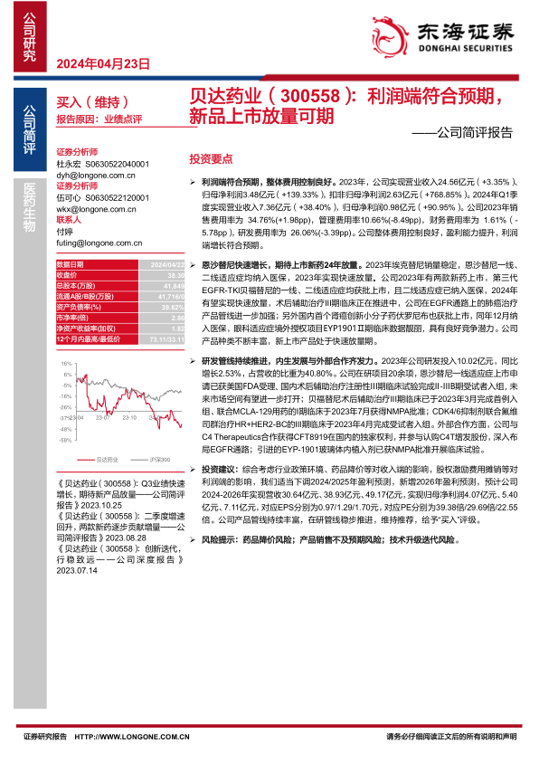 研发管线持续推进,内生发展与外部合作齐发力。2023年公司研发投入10.02亿元,同比增长2.53%,占营收的比重为40.80%。公司在研项目20余项,恩沙替尼一线适应症上市申请已获美国FDA受理、国内术后辅助治疗注册性III期临床试验完成II-IIIB期受试者入组,未来市场空间有望进一步打开;贝福替尼术后辅助治疗III期临床已于2023年3月完成首例入组、联合MCLA-129用药的I期临床于2023年7月获得NMPA批准;CDK4/6抑制剂联合氟维司群治疗HR+HER2-BC的III期临床于2023年4月完成受试者入组。外部合作方面,公司与C4Therapeutics合作获得CFT8919在国内的独家权利,并参与认购C4T增发股份,深入布局EGFR通路;引进的EYP-1901玻璃体内植入剂已获NMPA批准开展临床试验。