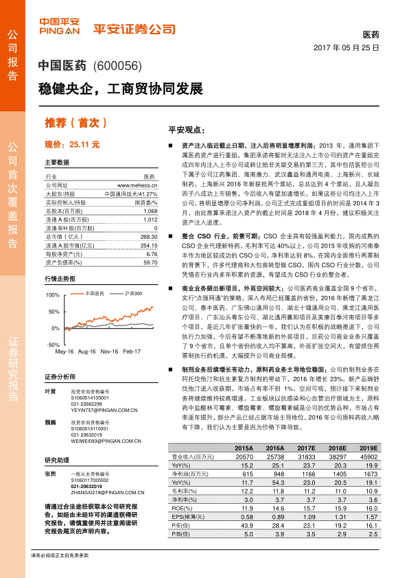 基于商业板块继续外延扩张、委内瑞拉订单持续带动国际贸易回暖、化学制剂业务在营销策略改革推动下维持良好增速,以及中成药业务在2017年完成GMP改造并投产等基本假设,平安证券预测公司2017年、2018年、2019年的营业收入将分别达到318.33亿元、382.97亿元和459.02亿元。预计同期EPS分别为1.09元、1.31元和1.57元,对应PE分别为23X、19X和16X。首次覆盖给予“推荐”评级。