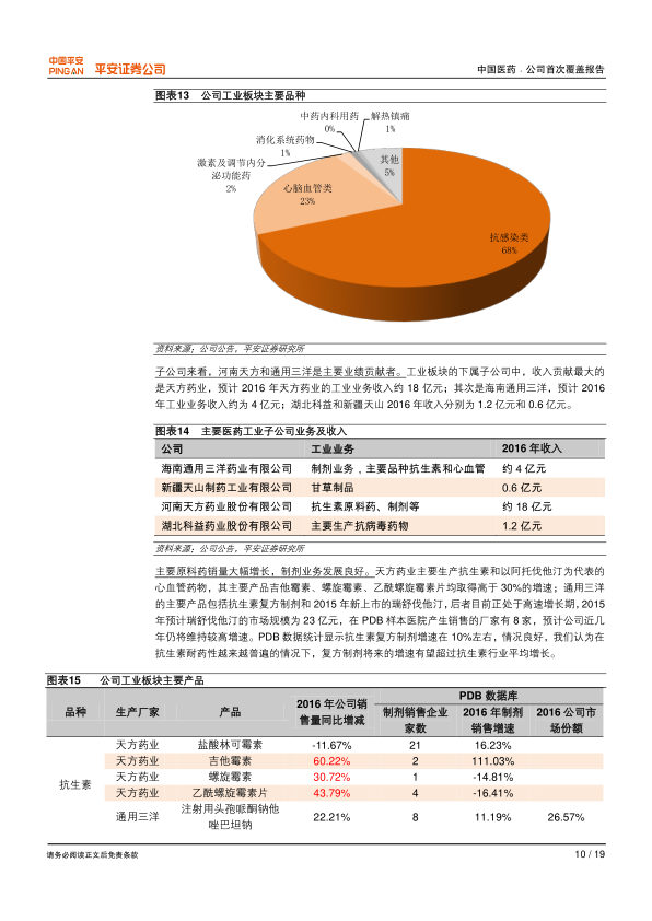 公司工业产品中,抗感染类收入占比68%,心血管类占比23%。河南天方药业和海南通用三洋是工业板块的主要业绩贡献者。天方药业主要生产抗生素和以阿托伐他汀为代表的心血管药物,其主要产品吉他霉素、螺旋霉素、乙酰螺旋霉素片均取得高于30%的增速。通用三洋的主要产品包括抗生素复方制剂和2015年新上市的瑞舒伐他汀,后者目前处于高速增长期,2016年销售额同比增长106.65%,在PDB样本医院市场份额达到31.78%。抗生素复方制剂近两年增速在10%左右,快于抗生素整体增速,预计未来增速有望超过抗生素行业平均增长。