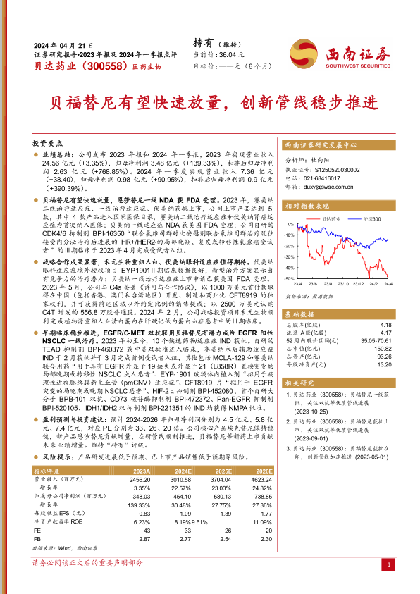 盈利预测与投资建议:预计2024-2026年归母净利润分别为4.5亿元、5.8亿元、7.4亿元,对应PE分别为33、26、20倍。公司核心产品埃克替尼保持稳健,新产品恩沙替尼贡献增量,在研管线顺利推进,贝福替尼等新药上市贡献未来业绩增量。维持“持有”评级。