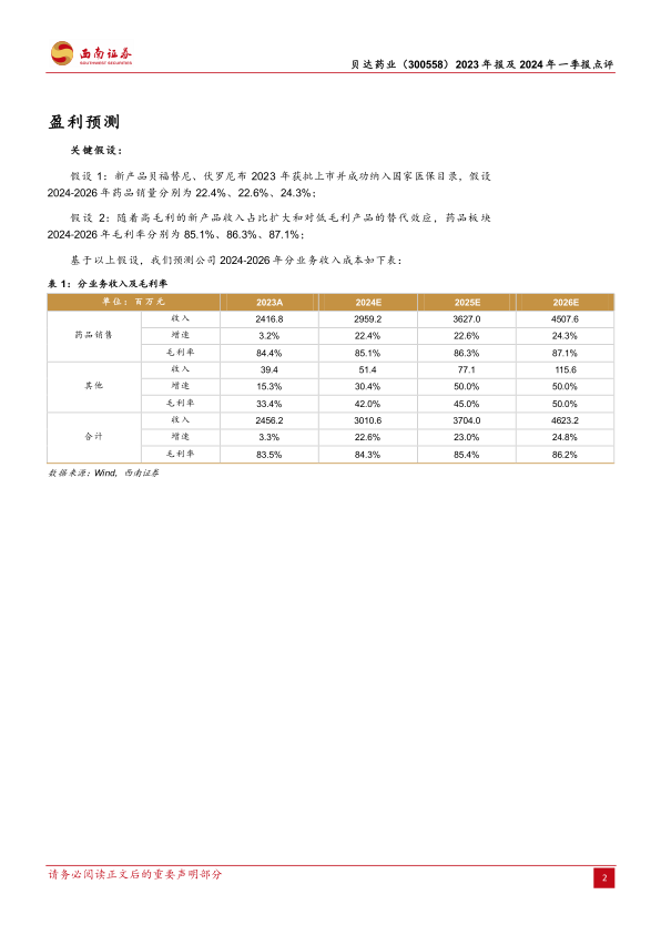 本报告对贝达药业2023年年报及2024年一季报进行了深入分析,核心观点如下: